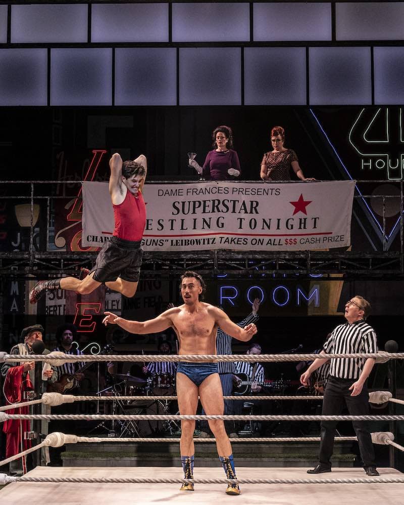 Cela commence par un match de lutte à la WWE. Notre hôte est l’annonceur Touchstone (Kayvon Khoshkam), élégant dans une veste à rayures bleues, des lunettes de soleil et des chaussures à plateforme blanches.