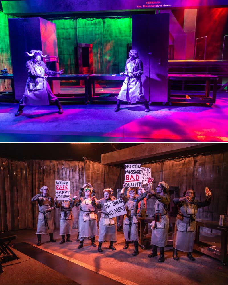 L'ensemble gris industriel et métallique d'Ethan Sinott, avec des panneaux en vinyle vertical qui maintiennent le froid de la réfrigération confiné sans empêcher le mouvement à travers les espaces, évoque la désolation sans fioritures d'un espace de travail consacré à la réalisation du sang des animaux. (Pas de jugement ici. Je veux dire, aux attentes de la viande, les vaches obtiennent un massage à l'avance, et ils laissent ce voile de larmes dans un état de contentement.) Mais il n'y a rien de frivole dans cet espace de panneaux et de métal sans couleur ni design pour distraire de la coupe et de l'emballage de la chair de la vache. Comme le directeur financier est autorisé à mettre en œuvre des innovations de plus en plus inhumaines, la musique gronde et grince pour annoncer l'entrée de la plus grande machine à mèche de chair la plus rapide de tous les temps. À un moment donné, la machine mange une partie du bras de l'un des travailleurs dédiés et épuisés.