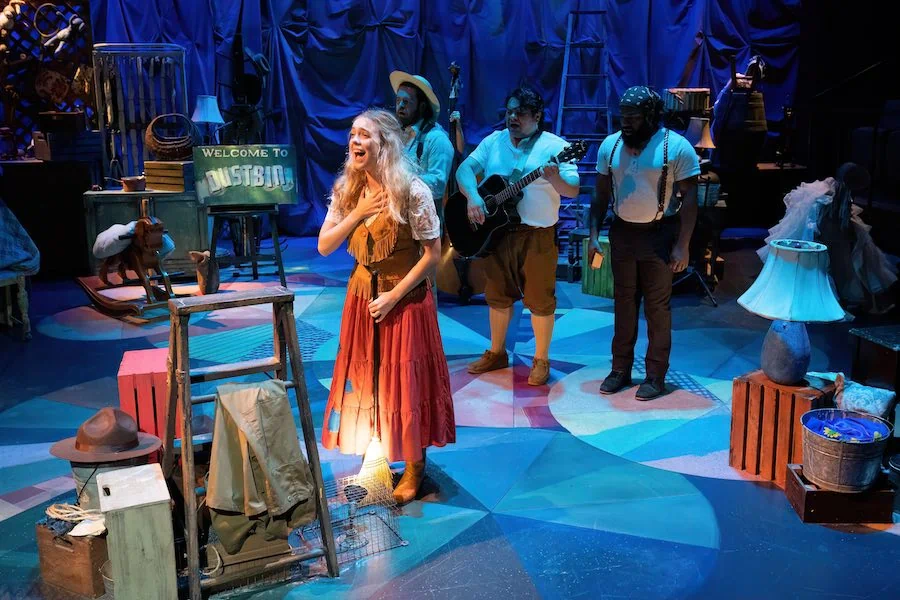 Le décor, l’éclairage et les costumes (respectivement réalisés par Lisa Laratta, Rachel Atkinson et Aaron Flynn) contribuent également grandement à cette magie. L’ensemble présente le genre de déchets que l’on pourrait trouver dans un garage ou un grenier, mais est utilisé efficacement dans tous les contextes où se déroule l’histoire : de la ville de Dustbin à un « désert » vague mais effrayant en passant par le sommet d’une montagne. Fidèle à l’ambiance d’une légende occidentale, le paysage de couleurs évolue des tons principalement beiges et plus foncés aux tons bleu sarcelle, jaune et orange vibrants qui caractérisent une image idyllique des plaines.