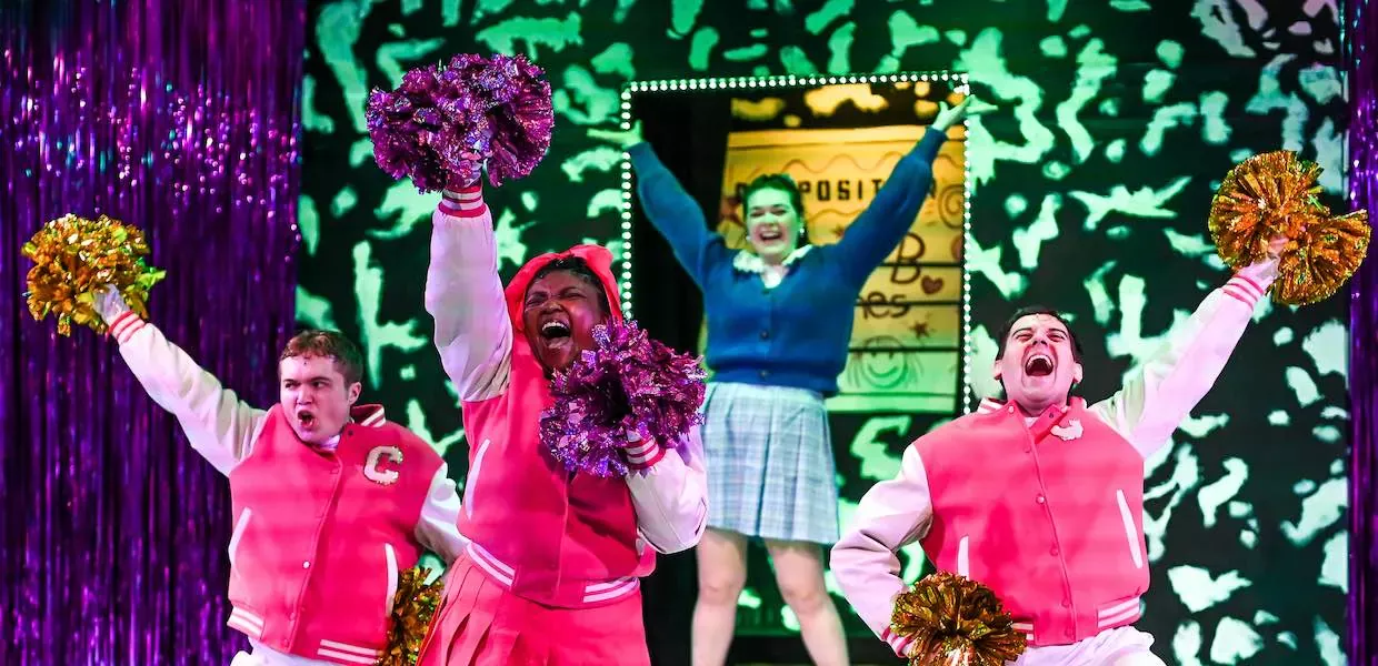 Il ne faut pas longtemps pour que les spectateurs adultes soient immédiatement impressionnés par ce spectacle. Le décor immersif de la scène, conçu par le scénographe Joshua Sticklin, stupéfie immédiatement dès l’entrée dans le théâtre – l’avant-scène et la scène sont complètement engloutis par des gribouillages et la texture visuelle d’un livre de composition, avec des banderoles métalliques roses couvrant les entrées et les sorties de la scène. . La conceptrice d’éclairage Lynn Joslin projette des lumières multicolores sur la scène et en particulier les banderoles, où les reflets et l’éclat des lumières transforment le théâtre en un brillant pays imaginaire Technicolor pour filles de première année.