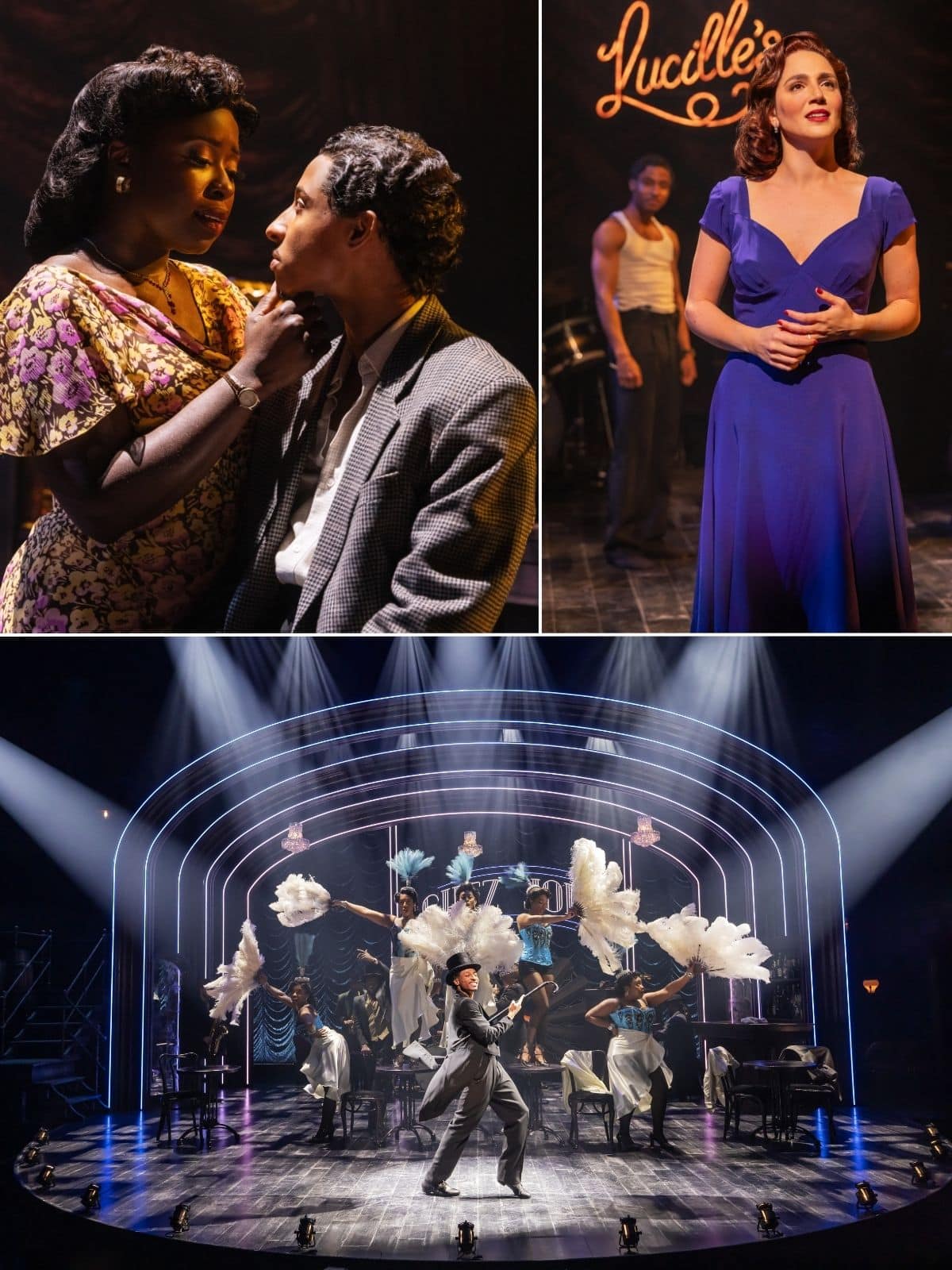 Le décor de l’Acte I de Derek McLane, avec son bar et ses tables simples, avec les musiciens sur scène et son rideau de spectacle festonné basique avec le surnom de Lucille, se transforme en un décor plus luxueux dans l’Acte II. Mais dans l’intime Théâtre Kreeger, l’espace est limité et des décors élaborés éclipseraient l’accent principal du spectacle sur le chant et la danse. Les costumes d’Emilio Sosa sont richement colorés et adaptés au style des années 40. Les hommes arborent des quilleurs – un clin d’œil aux « Bojangles » Robinson et autres tappers et costumes pointus ; les femmes portent des robes et des talons ou une tenue de répétition adaptée à l’époque. Les perruques de J. Jared Janas reproduisent les styles transformés privilégiés par les femmes et les hommes afro-américains du Nord.