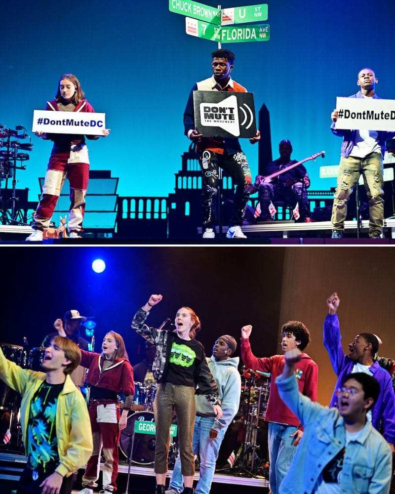 La magnifique scénographie équilibre la beauté esthétique avec une utilité intelligente. Depuis les silhouettes de l’architecture locale emblématique telle que le Washington Monument, le Musée de l’histoire afro-américaine et le Capitole jusqu’au contour du quartier sur le sol de la scène (avec des panneaux multicolores marquant différents quartiers), il suffit de regarder la scène. est suffisant pour susciter la fierté de la communauté, même lorsque les festivités à part entière de la nuit ne se sont pas encore déroulées. Bien que la carte soit certainement agréable à regarder, en utilisant des panneaux mobiles pour représenter les rues et les sites de la ville, la carte s’avère également utile pour ancrer le spectateur dans une relation physique et tangible avec chaque emplacement mentionné. De plus, chaque côté de la scène est orné d’un écran vidéo en forme de drapeau DC. Ces écrans font partie intégrante du succès du spectacle ; ils affichent les paroles que le public chante à chaque chanson de la soirée.