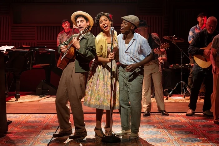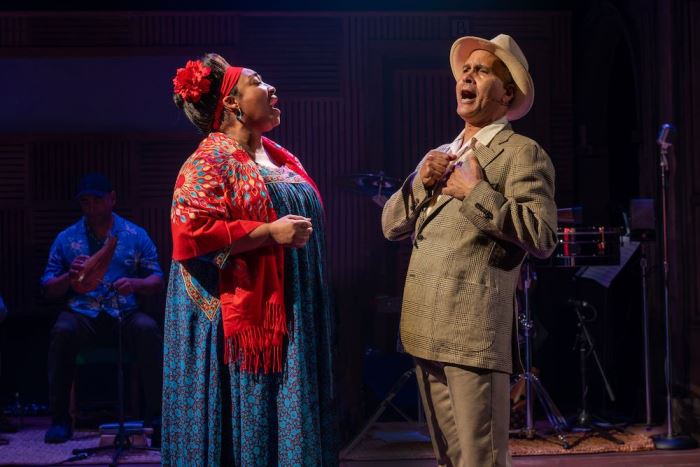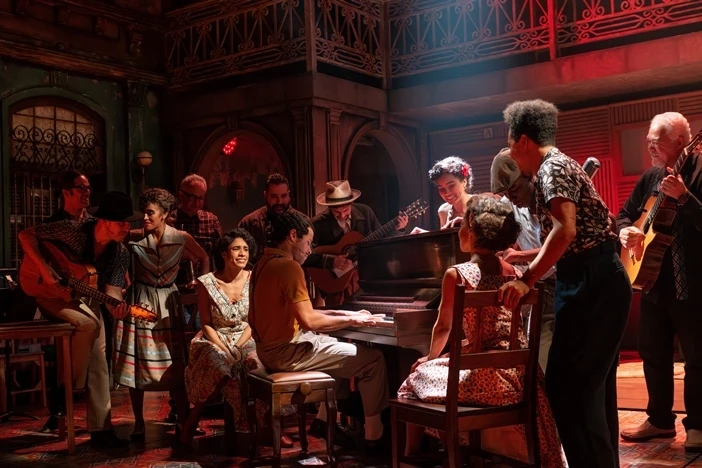 Encadré dans le contexte de la réalisation de l’enregistrement en studio, le spectacle va et vient de 1996 à 1956, avec de courtes scènes sous forme de jeu de mémoire intercalées entre les interprétations dynamiques de quinze des chansons originales du groupe. Ceux-ci incluent leur tube emblématique « Chan Chan » et le numéro de danzón remarquable « Candela », interprété par treize musiciens internationaux magistral (David Oquendo, Renesito Avich, Gustavo Schartz, Javier Diaz, Mauricio Herrera, Román Diaz, Guido Gonzalez, Edward Venegas, Hery Paz, Leonardo Reyna, Jared Machado et Julio Monge, sous la direction du directeur musical et pianiste Marco Paguia, qui a également assuré les orchestrations et les arrangements, avec des arrangements supplémentaires de Diaz et Oquendo), avec un ensemble de premier ordre (Skizzo Arnedillo, Angélica Beliard , Carlos Falú, Héctor Juan Maisonet, Ilda Mason et Marielys Molina) et les membres du casting dansant, bougeant et se déhanchant – tout comme le public, dans leurs sièges et dans les allées – sur des rythmes latinos entraînants (chorégraphie de Patricia Delgado et Justin Peck). Même si les chansons ne font pas avancer l’intrigue au sens traditionnel d’une comédie musicale, elles définissent le style et l’ambiance et génèrent l’énergie et l’excitation du spectacle.