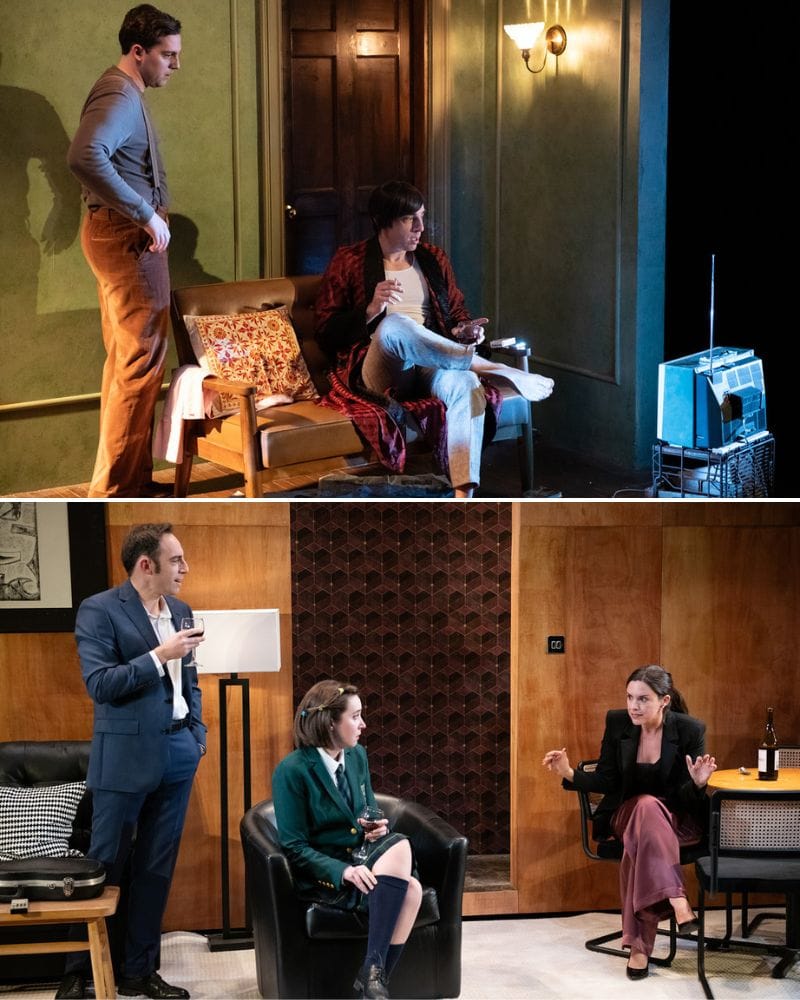 La production dans son ensemble sert à encadrer les liens sociaux de ces personnages – littéralement, dans le cas de l’avant-scène austère placé autour de l’action dans l’espace Shargai du Studio. Hormis un épanouissement musical curieusement flamboyant au début du deuxième acte, Muse dirige le tout d’une main ferme, laissant ses acteurs trouver les rythmes et les silences qui remplissent leur relation. À leur support se trouve le décor d’Alexander Woodward, élégant dans sa simplicité, même lorsque l’appartement londonien bon marché du premier acte est censé être tout sauf élégant. Au fur et à mesure que la pièce progresse, les quartiers d’habitation de Kenneth évoluent également, d’abord avec des panneaux de bois et des équipements stéréo de premier plan vers la fin des années 80 et le début des années 90, puis vers le luxe blanc cassé à aire ouverte de la fin des années 2000. À mesure que les décors de Woodward s’agrandissent, les costumes de Montana Levi Blanco se resserrent également, emmenant Kenneth du combo veste de smoking et maillot de corps de son début d’âge adulte à un numéro à col roulé entièrement noir à sa retraite.