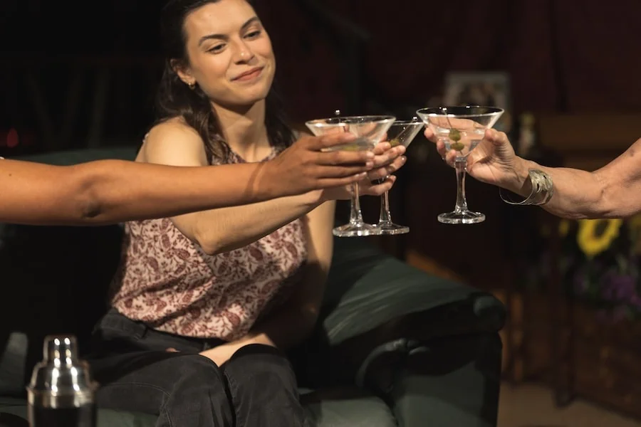 Au début, l’espace semblait trop intime. Jouer comme au théâtre à un mètre de distance nécessitait définitivement un ajustement de ma part. Mais au fur et à mesure que le spectacle avançait et que les personnages devenaient plus réels, la configuration intime semblait être une opportunité pour nous tous – public et acteurs – de rire ensemble. Grâce aux efforts combinés de Gerardo Mijares-Shafari, Allegra Hatem et Courtney Elkins, l’ensemble place trois lieux sur un plan unilatéral. On se sent chez soi et les meubles ont une ambiance de braderie d’église convenablement datée. Dès que j’ai observé le canapé vert, les coussins matelassés et les verres à martini, j’ai su que quelqu’un allait vivre avec un parent.