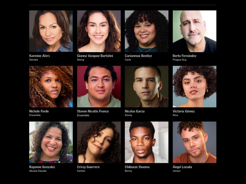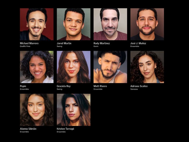 Le casting de Dans les hauteurs comprend Karmine Alers (Broadway LOUER, À vos pieds) comme Daniela, Carianmax Benitez (Keegan's Seussical, joyeusement nous roulons) comme Carla, Berto Fernandez (Le Théâtre Cygnet ÉvitaThéâtre musical de San Diego Attrape-moi si tu peux) comme Piragua Guy, Nicolas Garza (Le représentant de Seattle Dans les hauteursThéâtre ZACH L'héritage) comme Sonny, Victoria Gomez (Signature Les ponts du comté de MadisonKeegan's Seussical) comme Nina, Rayanne Gonzales (Signature Les ponts du comté de Madison, Sweeney Todd) comme Abuela Claudia, Crissy Guerrero (Théâtre Two River Mariachi américainCentre de théâtre de Dallas Dans les hauteurs) comme Camila, Chibueze Ihuoma (Broadway HadestownThéâtre Hangar Une fois) comme Benny, Ángel Lozada (Broadway Mauvaise CendrillonOff-Broadway Oratorio pour les êtres vivants) comme Usnavi, Michael Marrero (Tournée nationale de Peter PanGateway Playhouse ÉTÉ : La comédie musicale d'été de Donna) en tant que Graffiti PeteRudy Martinez (Cleveland Playhouse's Dans les hauteursThéâtre Marriot Dans les hauteurs) comme Kevin, et Adriana Scalice (Tournée nationale de SixTournée Nationale de Méchantes filles) comme Vanessa. L'ensemble de Dans les hauteurs est complété par Nicole Fordé (Off-Broadway Anne… la maison aux pignons vertsGatehouse Playhouse Évita), Steven Nicolas Franco (Compagnie de Théâtre Monumental Réveil du printempsScène d'imagination Cendrillon : un conte de fées salsa), José J. Muñoz (Les MUNY Dans les hauteursGC Productions' Chats), Pépin (Tournée nationale de À vos piedsCentre de théâtre Olney Un violon sur le toit), Matt Rivera (Tournée nationale de À vos piedsLes MUNY Légalement blonde), Alanna Sibrián (Le stade de l'imagination Cendrillon : un conte de fées salsaNYU Mariposa), et Kristen Tarragó (Tournée nationale de À vos piedsThéâtre pour enfants de Miami Une ligne de chœur). Gianna Vásquez Bartolini (Gateway Playhouse's Évita), Jared Martin (Le Théâtre Mac-Haydn Une ligne de chœur), et Graciela Rey (Signature Une chose amusante s'est produite sur le chemin du forum) sont des balançoires.