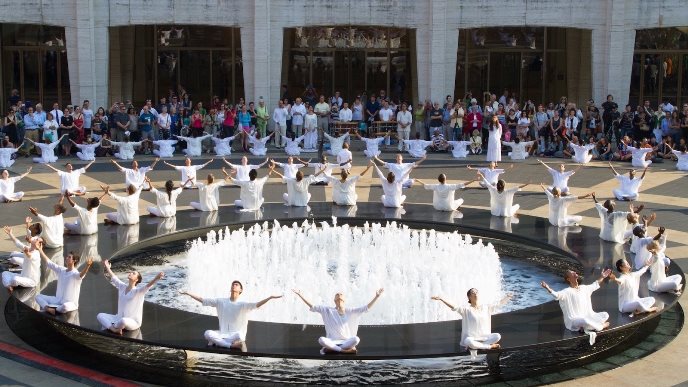 Ce paysage sacré se remplit de l’énergie transcendante du Mandala, reliant les danseurs et les spectateurs aux rituels de guérison du monde naturel. Cachée dans la poche de la robe des danseurs se trouve une sculpture en assiette de céramique, métaphore d’un rassemblement de l’humanité à la table du banquet pour la paix. A 8h46, les danseurs tournent leurs poignets paumes ouvertes et tendent les bras vers le ciel pendant 60 secondes dans un geste de paix universelle.