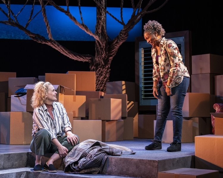 La scénographie de la scénographe Kathryn Kawecki et la conception de la propriété de Pauline Lamb sont particulièrement imprégnées de belles touches métaphoriques — les boîtes sont empilées à tous les niveaux et les personnages emballent et déballent leurs souvenirs — une forme en forme d’arbre, liée par des cordes, reflète le racines et connexions dans l’Arbre de Vie que nous partageons tous. L’éclairage d’Adam Mendelson et la conception sonore de David Lamont Wilson renforcent encore plus la métaphore, nous rapprochant de ces deux femmes alors qu’elles se rapprochent l’une de l’autre.