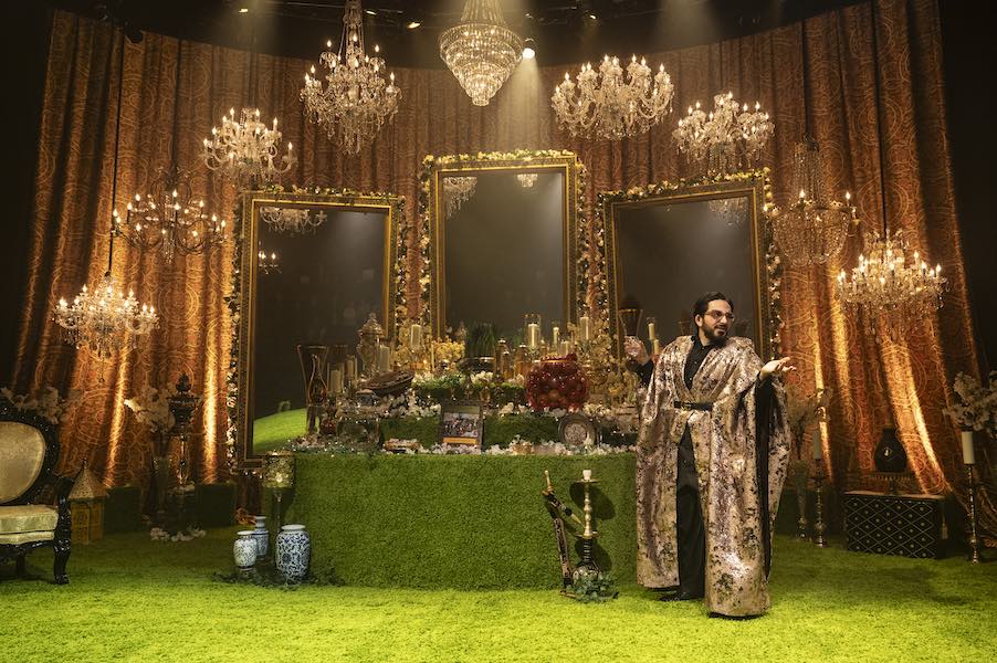 Avaaz commence dès que vous contournez la banque de sièges du laboratoire de théâtre Mulitz-Gudelsky du Olney Theatre Center. L’ensemble, superbement conçu par Beowulf Boritt, semble apparaître par magie alors que la musique persane festive vous entoure au volume de la fête. C’est un régal pour les yeux : des miroirs suspendus encadrés de guirlandes lumineuses et de fleurs, une opulence de lustres, des ors et des verts luxuriants et une merveilleuse table à plusieurs niveaux dressée pour un grand événement. Alors que les membres du public entraient avec un chœur de Ouah’s, je me penchais déjà vers l’histoire, pleine de curiosité.