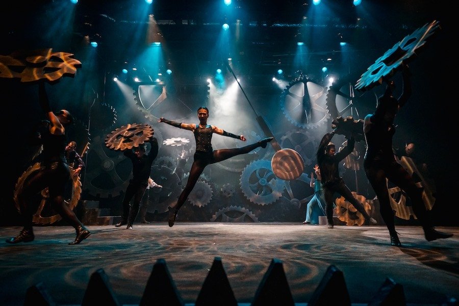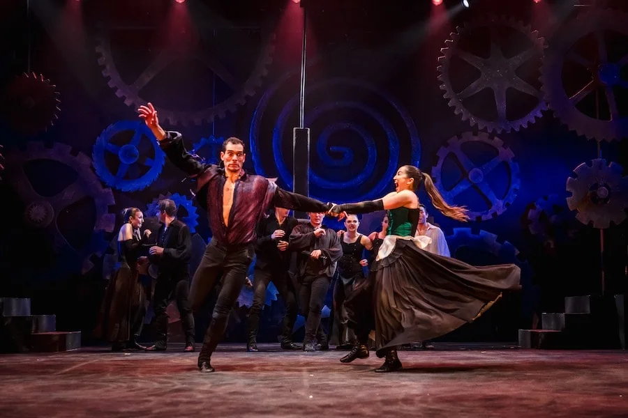 Le point central de cette performance est le temps. La scénographie est industrielle et clairsemée, composée presque uniquement de grands engrenages d’horloge et d’un pendule oscillant. Tsikurishvili tient à présenter le temps comme un personnage lui-même – on pourrait dire le méchant ultime de l’histoire. Dans de nombreuses scènes, les deux amants, Zana Gankhuyag dans le rôle de Roméo et Irina Kavsadze dans le rôle de Juliette, tourbillonnent sur la scène en changeant de vitesse sous la direction d’autres danseurs. Dans d’autres scènes, les mouvements de danse eux-mêmes deviennent mécaniques et robotiques, imitant le cliquetis des engrenages d’une montre impitoyable.